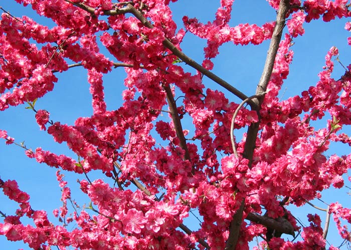 Vivid purplish-red double flowers, very early. Used in Southern California for Chinese New Year. Small, sweet, light green-skinned fruit. Fast growth to 20 x 20 feet Prune after bloom for best results next year.