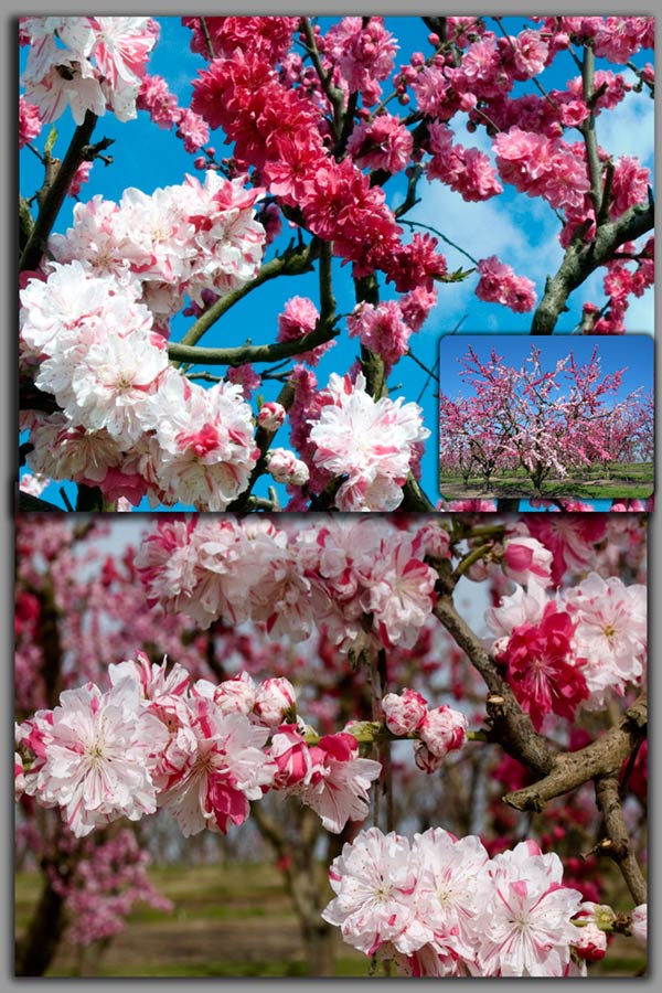 Naturally-occurring, artsy assortment of red, white, pink and variegated double flowers. Very showy and unusual. Fast growth to 20 feet high x 20 feet wide.