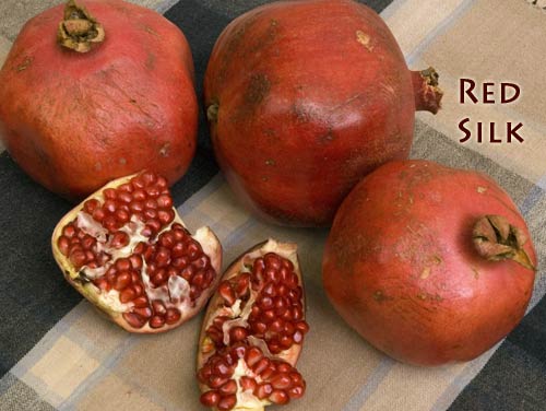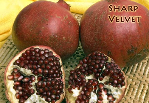 Large sized pomegranate with a very appealing, unique mildly acid refreshing flavor. Fruit has a dark red exterior and dark seeds, the color of crushed-red velvet. Upright growing plant sets huge crops of highly ornamental fruit and can be kept any height with summer pruning. Eat fresh or use in cooking. An excellent source of antioxidants. Requires 150-200 chill hours. Self-fruitful.